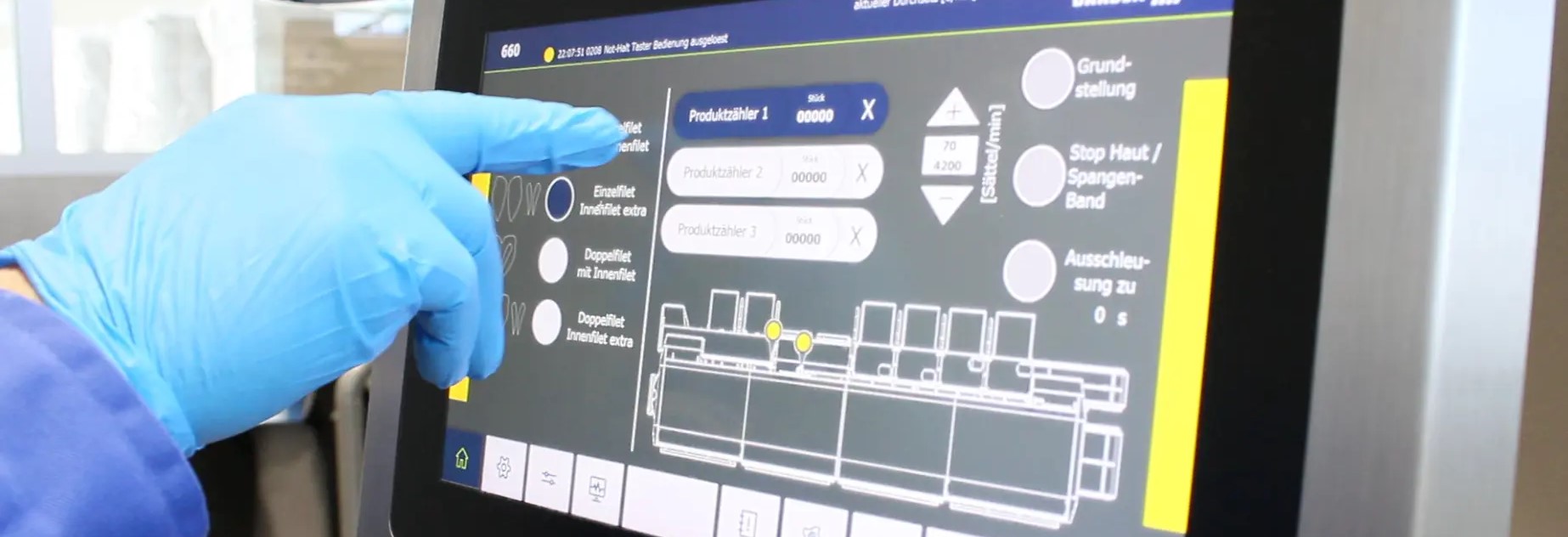 The BA 660A includes an intuitive Human‑Machine Interface (HMI) on a touchscreen, enabling fast production control and timing adjustments. Operators can choose from four pre‑set recipes, which simplifies changeovers and reduces setup time. For even greater control, the system can be fitted with ClassifEYE® rest‑meat detection, which uses AI vision to track residual meat in real time.